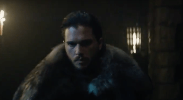 First there’s Jon Snow walking and he’s looking very Jon Snow-like.