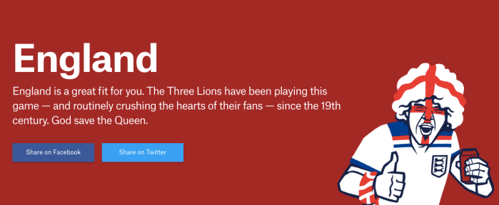 So why England? Well, according to FiveThirtyEight, England is a middle of the pack team, has balance scoring, as well as a balanced offense and defense, passes a lot before attacking, doesn’t rack of penalties and fouls and has a good-sized fan base here in the states. The only answer I had that doesn’t match England was the last one, the level of enthusiasm for when a goal scores. But I think that’s just semantics and I’m not going to dwell too much on that one.